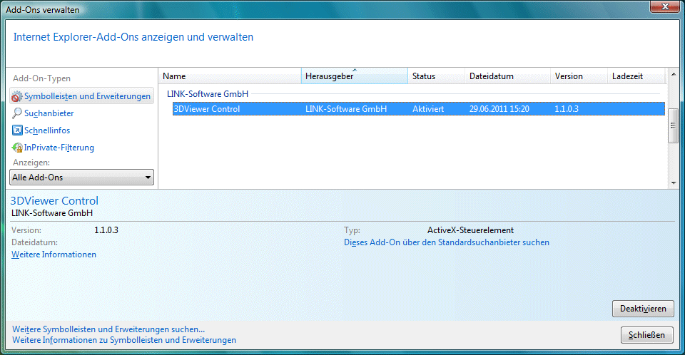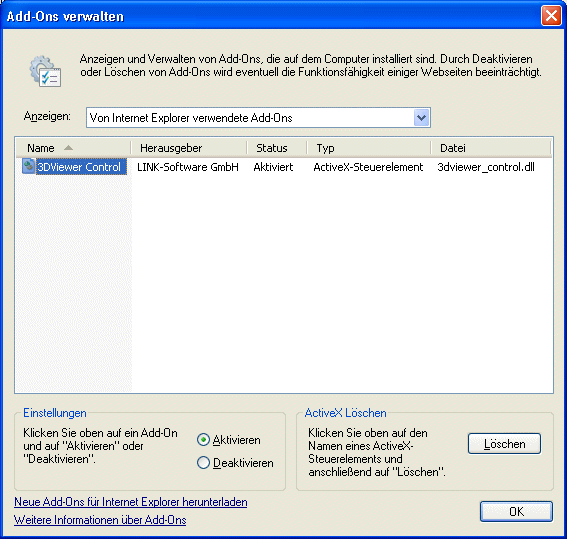 Wenn Sie das 3DViewer ActiveX Control für Microsoft Internet Explorer unter Microsoft Windows wieder entfernen möchten, gehen Sie bitte wie folgt vor, um eine vollständige Deinstallation des Controls sicherzustellen: