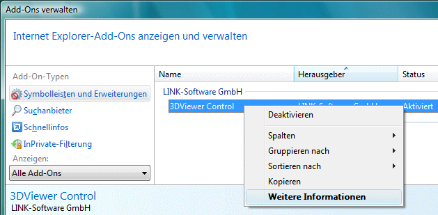 Klicken Sie in der Liste das 3DViewer Control mit der rechten Maustaste an und wählen Sie dann Weitere Informationen im Kontextmenü.